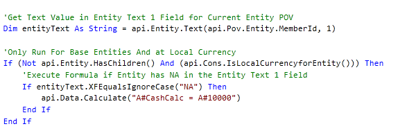 Example: api.Entity.PercentOwnership(api.Pov.Entity.MemberId, api.Pov.Parent.MemberId, api.Pov.ScenarioTypeId, api.Pov.Time.MemberId).XFToStringForFormula
