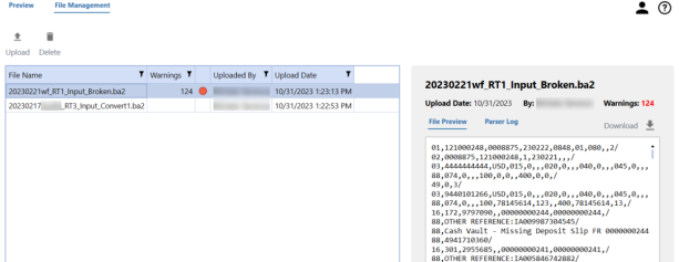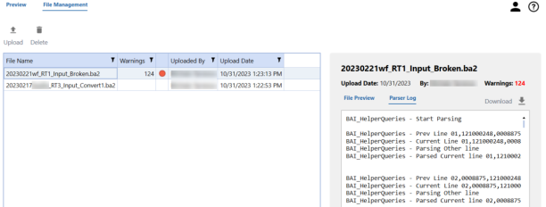 You can manage the list of files displayed in the overview grid on File Management by deleting files. Deleted files will only be removed from the BAI Parser Solution. All data uploaded to a workflow will be preserved.