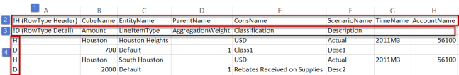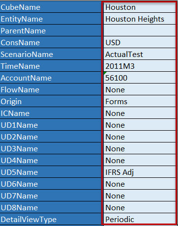 After the Header Parameter is configured, enter the Cell Detail column headers. The required Cell Detail Headers specify the Cube and all 18 Dimension Members. For more details on these, refer to Cell Detail Excel Template. -