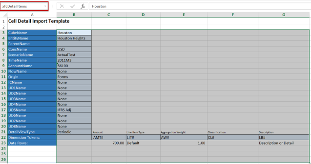 When loading Cell Detail via Excel, a specific template must be created to determine the Cell Detail Dimension Tokens and each Cell Detail line data.