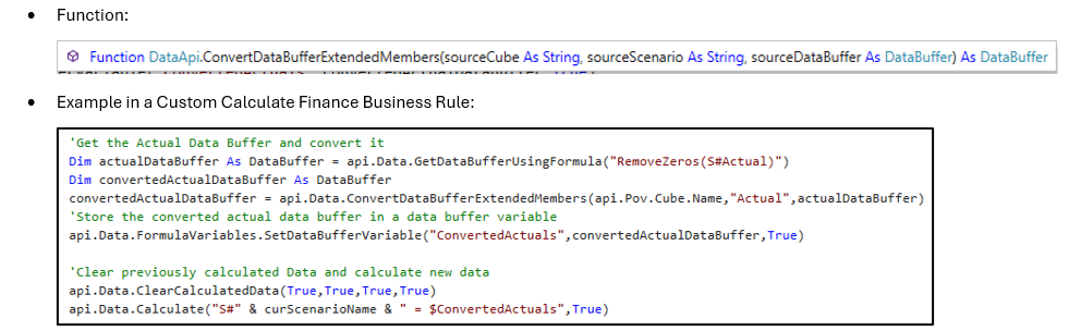 Consider the .Where() and .Options() member expansion functions when writing calculations across the platform. They are necessary at times to make calculations more targeted, and they can make them more dynamic. Another consideration is the function api.Data.ConvertDataBufferExtendedmembers when copying data across extended dimensions. Copying actual data into a forecast is frequently necessary. This function is a performant way to do so while accounting for extensibility. The ConvertDataBufferExtendedMembers function aggregates the data from extended members in the source data unit to the base level of the target data unit. After aggregating the data in memory, it can then be manipulated or stored using the target dimensionality.