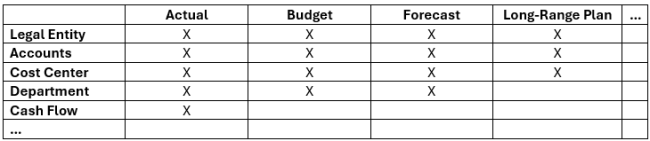 This chart visualizes that actuals and long-range planning should utilize separate Scenario Types to vary the inclusion and exclusion of entire dimensions. Next, build a chart that provides clarity for the differences between shared dimensions. As determined from the previous chart, all four processes need accounts. To determine which accounts are needed, compile a list of all possible members and hierarchies and repeat the process to identify where they should be valid.