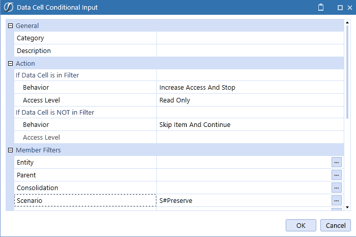 Data cell conditional input restricts access to certain intersections or slices of the cube. This behavior might not be desired for all scenarios, time periods or other elements, so this is a simple way to omit these rules for specific elements. The following method is useful when there are many data cell conditional input rules not defined by a scenario at the time of creation. After these rules are created, however, a scenario becomes a factor for historical data.