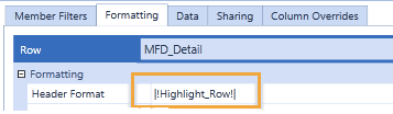 This next step is optional. Add a header format using a cube view style. This displays the row in a color different from the other rows to indicate the row is clickable. In this case, |!Highlight_Row!| is related to a parameter that was made in a sample application. When this cube view is run, the format of TextColor=Blue activates for this row.