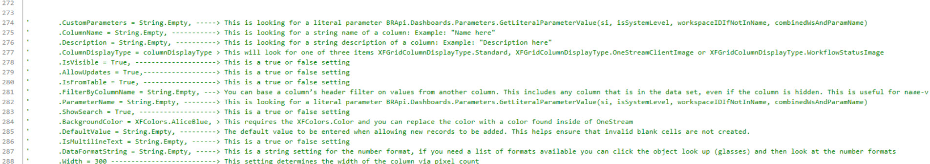 The following grid formatting properties are available for use in the workspace assembly. See below for an example of how to configure a column definition object using these properties.