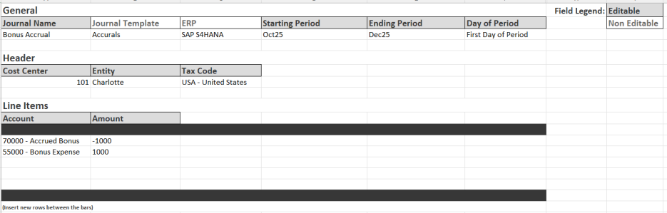 Recurring Journal Definitions can be created manually using the Journal Entry Manager UI or imported using Excel templates. This supports efficient setup and maintenance of recurring journal definitions, especially when working with large volumes.