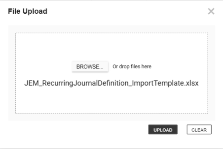 After creating or editing a recurring journal definition, click the Import button and upload the Excel file.