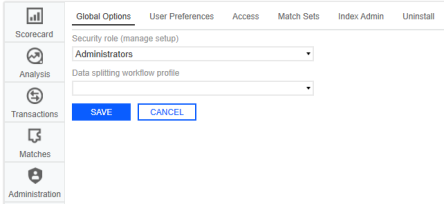 The Settings page contains the Global Options sub-page in which key properties that guide administration are set as well as User Preferences, Access, Match Sets, and Uninstall sub-pages. |