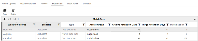 The Match Sets list displays all match sets and their respective Access Group, identified by a Workflow Profile and Scenario.