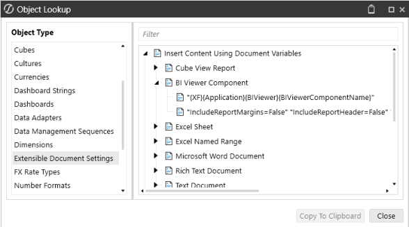 Use the search filter or scroll to locate Insert Content Using Document Variables > BI Viewer Components.