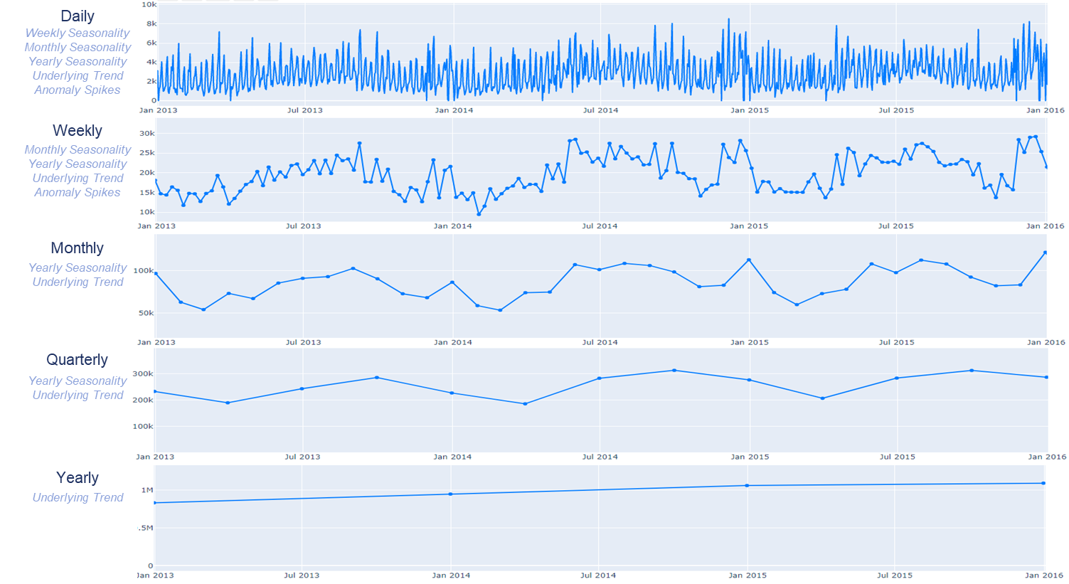 The following graphic overlays the same sales data at varying levels of aggregation (daily, weekly, monthly, quarterly, yearly). As aggregations continue up to yearly, different forms of seasonal variation and anomalies become hidden.