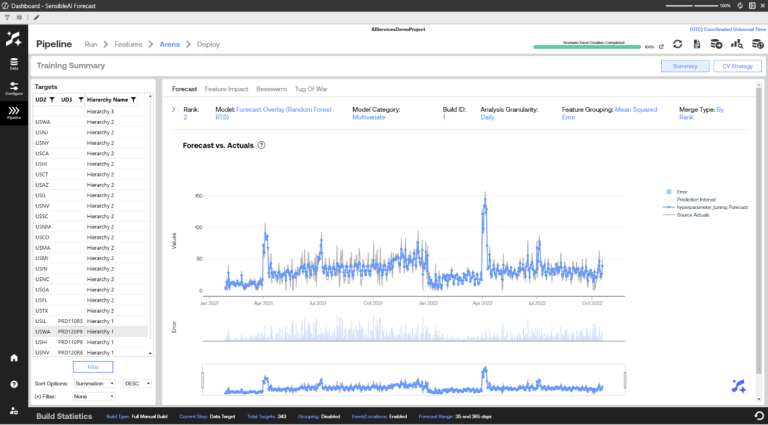 To analyze the training results, click a target in the Targets pane to see the accuracy metrics of each it its deployed models if implemented over the course of its past data. Each model listed shows its name and category, along with the type of evaluation metric used and the evaluation metric score. Select a model name in the models list to view a line chart that shows how close the forecasted values are to the actuals.