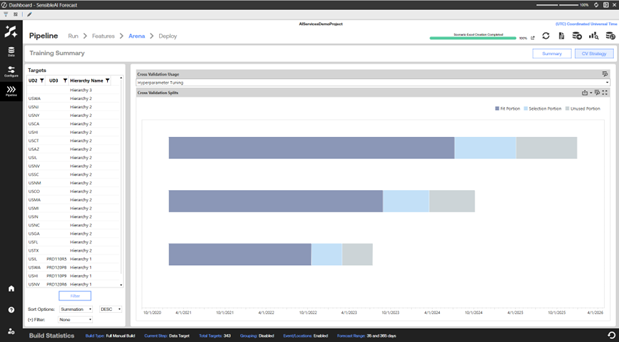 Validation Set: The split of historical data on which the optimal hyperparameter set is selected for each model, if applicable. A model makes predictions on the validation set time period for each hyperparameter iteration. The hyperparameter set with the best error metric when comparing predictions to the actuals in the validation set time period is selected. This split does not occur when the historical data set does not have enough data points.