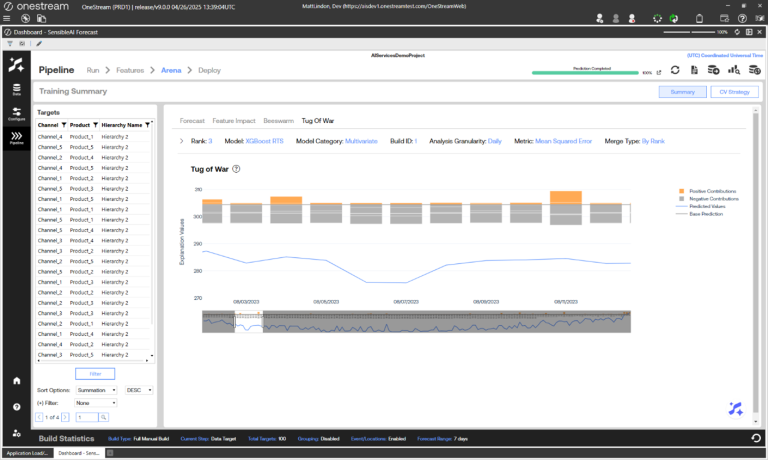 The Arena page consists of different views (Forecast, Feature Impact, Beeswarm, and Tug of War). To select a view, click on its button at the top of the page.