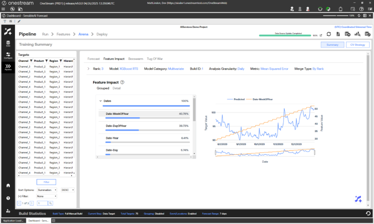 The Feature Impact view shows the hierarchical (Grouped) or individual (Detail) feature impact percentages aggregated across all the model’s prediction values. The user can click on a feature name from the table to view its actual values compared with the predictions and actuals in the visual on the right. The prediction and actual values are bound by the primary y-axis on the left hand side of the graph, while the feature values are bound by the secondary y-axis on the right. The feature impact score shows how much influence the feature had for a given model.