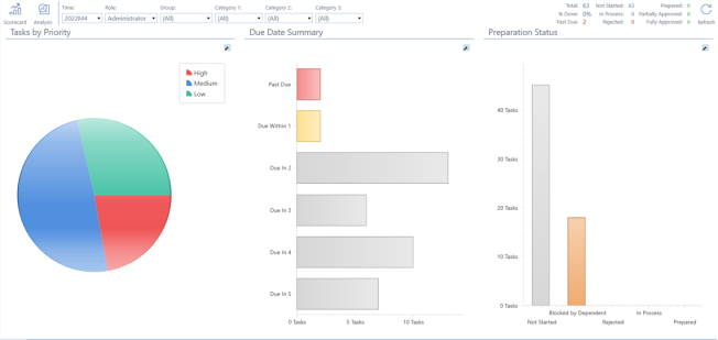 The Scorecard page provides an overview of where tasks are in terms of preparation status, approval status, and due date.
