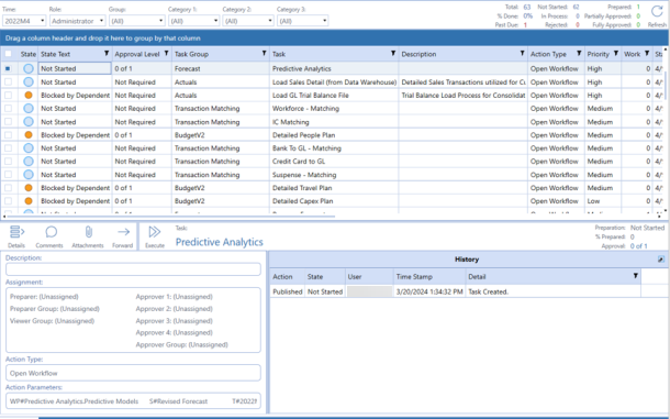 The Task Grid View provides a way for Viewers, Preparers, and Approvers to view and work on their tasks from within a grid. Task Grid View and Task Gantt View are where Administrators and task Preparers can do most of their task processing.