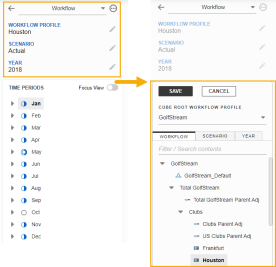 The Workflow POV Edit menu is displayed as an overlay menu, instead of a pop-up dialog. Users are able to update Workflow, Scenario, and Year using the available tabs. A Save button at the top of the section finalizes any changes.