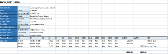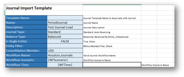 After the Header Parameter is configured, enter the Journal Column Headers. The required Journal Headers are JournalName, OrigniatingTemplateName, JournalDescription,JournalType, JournalBalanceType, IsSingleEntity, EntityMemberFilter, ConsName, WFProfileName, WFScenarioName, WFTimeName and CubeTimeName. For more details on these, refer to the Journal Excel Template. -