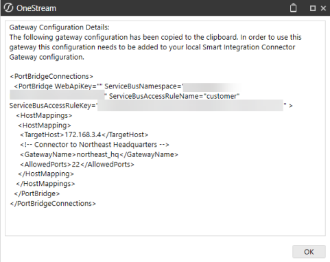 You must copy the gateway configuration settings and paste them into your Smart Integration Connector Gateway to establish the connection.