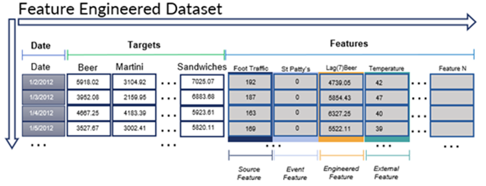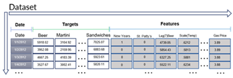 Targets and Features: A target is a subject that is to be forecasted and is represented by a single series of historical data (such as beer, martini, and sandwich sales).