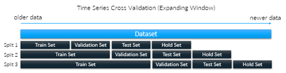 A cross-validation for a time series uses methods such as walk-forward cross-validation (or sliding-window) and expanding-window cross-validation (or forward-chaining). The following images illustrate these methods.