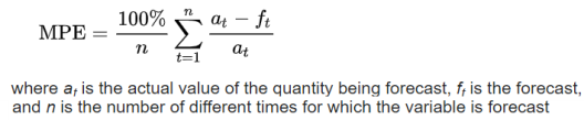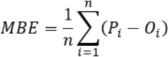 Interpretation: Typically not used as a measure of model error, as high individual errors in prediction can also produce a low MBE. MBE reflects a prediction's average bias. A positive value represents overestimating bias and a negative value represents an underestimating bias.