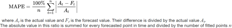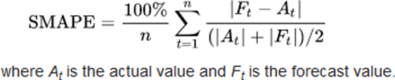 The absolute difference between At and Ft is divided by half the sum of absolute values of the actual value At and the forecast value Ft. The value of this calculation is summed for every fitted point t and divided again by the number of fitted points n.