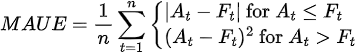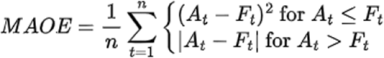 Similar to Mean Asymmetric Over Error (MAOE), but applies Mean Squared Error (MSE) to predictions below the actual value and Mean Absolute Error (MAE) to predictions above the actual value.