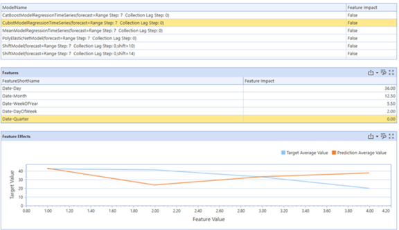 The following example looks at the feature effects of the Cubist Model for the feature Date-Quarter and a specific target. The average prediction on all the days the Date-Quarter takes on a value of 2 is roughly 20, and the average actuals is roughly 40. This same logic can be applied to all the feature values Date-Quarter takes on, namely, 1, 2, 3, and 4.