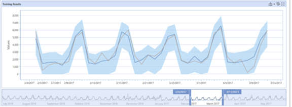 In the following example, the orange line is the point forecast and the shaded blue region around the orange line is the prediction interval.