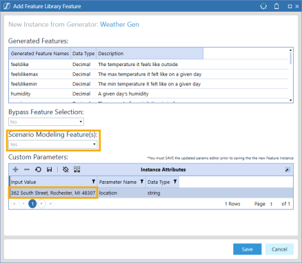 TIP: You can use custom parameters to further customize generated features. For example, when creating an instance using the WeatherGen Generator, you can enter a location parameter to get the WeatherGen Features for a specific location.