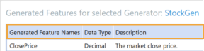 Select a generator from the Generators pane to show its generated features in the Generated Features pane. This can be one to many features, depending on the type of generator. The Generated Features pane also displays the following information for each selected generator.