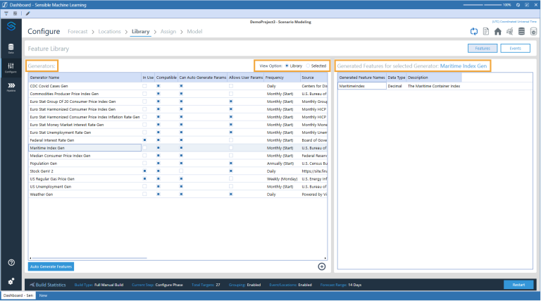 The Features view of the Library page in the Configure section lets you select the generators used to add external features to the data set. External features can increase the predictive accuracy of the Machine Learning models. You can create multiple data sets containing features (also known as generator instances) from the library of generators that Sensible Machine Learning provides.