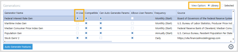 Compatible: A checked box means the generator is compatible with the current model build. This is based on number of data points, frequency, and the data set's earliest start date.