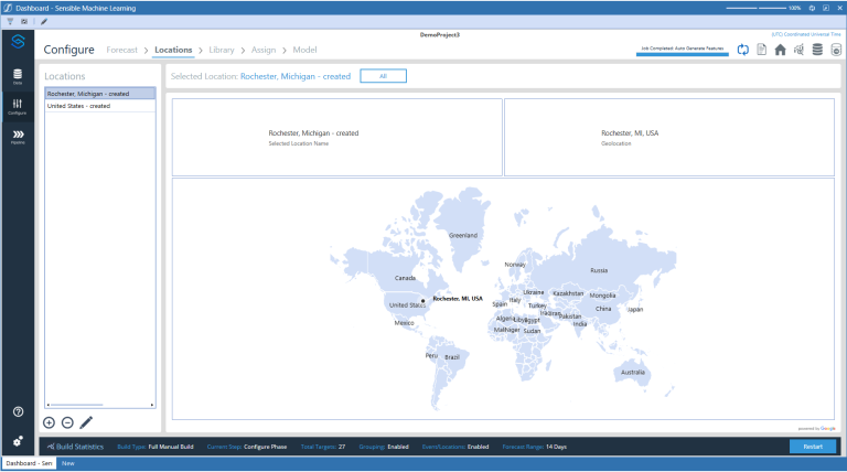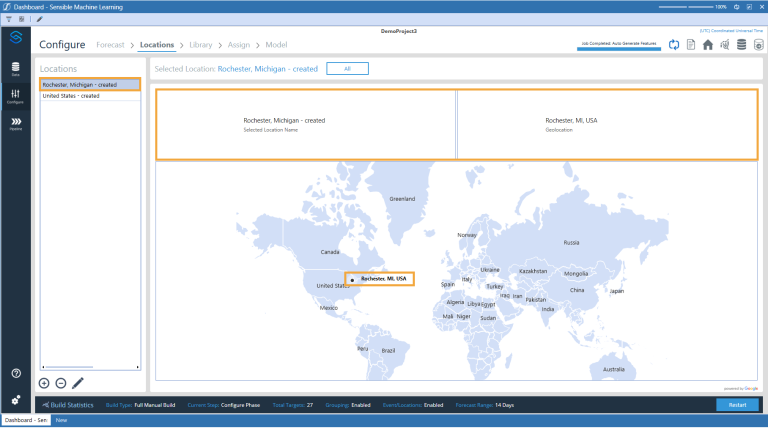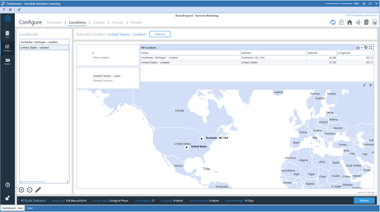 IMPORTANT: Be aware of the geolocation assigned to a location name. For example, if a location name of Rochester is imported through a location dimension of the target data set, it may map to Rochester, New York by default, regardless of whether that location was meant for Rochester, Michigan. In a situation like this, the Rochester location should be edited with an address of “Rochester, Michigan."