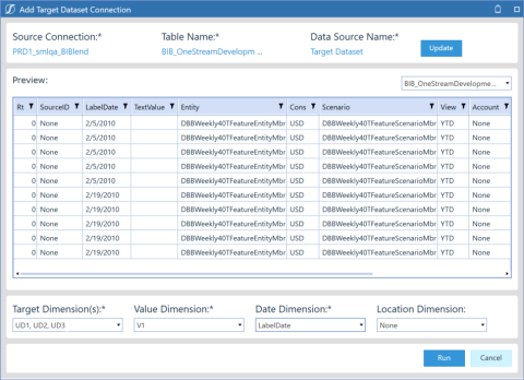 If any data in the Data Source Preview pane is not as expected, you can click Update to open the Update Target Database Connection dialog box and reselect target data source dimensions, or click Update in the dialog box to change target data set connection information.