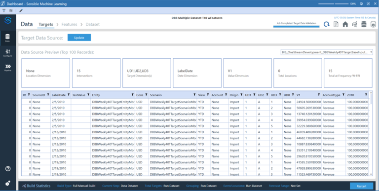 After configuring your source data in OneStream and creating your Sensible Machine Learning project, you can use the Targets page (Data > Targets) to configure your target source data to use in your model. This is a two-step process.