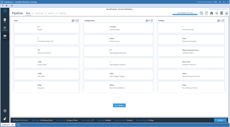 When running a pipeline, all specified data configurations are brought together to generate and transform the data. It then selects the most predictive features and iteratively trains and tests models against historical data. This is the longest run of the solution because it is where the most data science work completes.