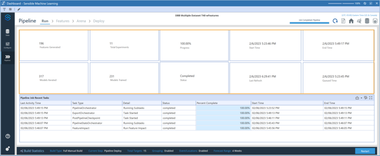 Total Experiments: Total number of groups plus single targets being run in the model build. The AI Services engine is running an experiment for each of these targets or groups to find the best model possible.