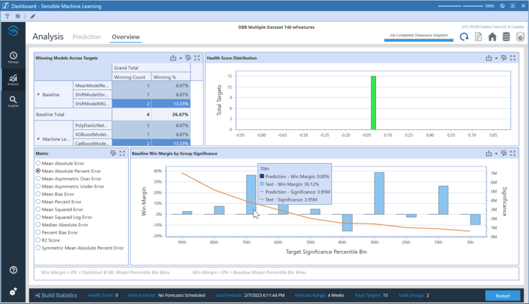 When you make changes to the Metric radio buttons, the Health Score Distribution and Baseline Win Margins by Grouped Significance charts dynamically update.