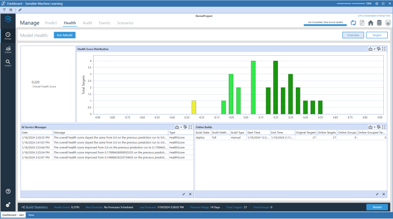 The Project Overview view shows a color-coded distribution chart visualizing the health of the best models. The Overall Health Score is a scaled metric ranging between -1 and 1, which indicates improvement or degradation in a model’s predictive accuracy.