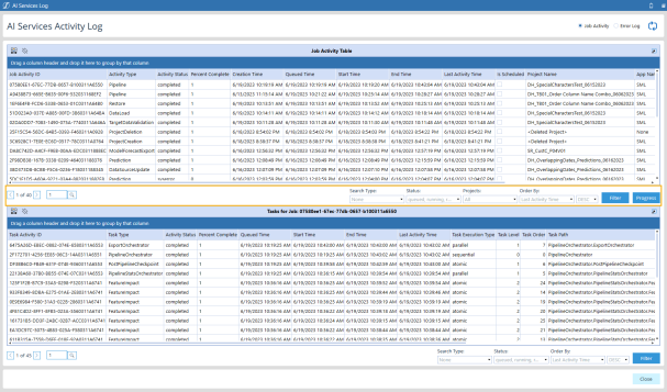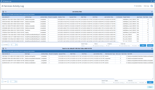 Sensible Machine Learning tracks all jobs and each job's tasks. Use the Job Activity Table in the AI Services Activity log to see general job traffic and job details, completion status, queue order of jobs set to run immediately or on a schedule, and other job and task details.