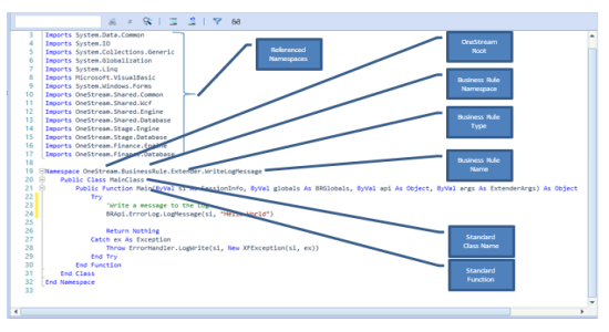 Each OneStream Business Rule has a predefined Namespace, a Public Class and a Public Function that the OneStream platform engines invoke when the Business Rule needs to be called.