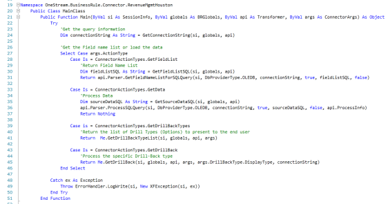 ByVal connectionString as String) As DrillBackResultInfo Try Select case drillBackType case is = ConnectorDrillBackDisplayTypes.FileShareFile 'Show FileShare File Dim drillBackInfo as new DrillBackResultInfo drillBackInfo.DisplayType = ConnectorDrillBackDisplayTypes.FileShareFile drillBackInfo.DocumentPath = Me.GetDrillBackDocPath(si, globals, api, args) return drillBackInfo case is = ConnectorDrillBackDisplayTypes.DataGrid 'Return Drill Back Detail Dim drillBackSQL As String = GetDrillBackSQL(si, globals, api, args) Dim drillBackInfo as new DrillBackResultInfo drillBackInfo.DisplayType = ConnectorDrillBackDisplayTypes.DataGrid drillBackInfo.DataTable = api.Parser.GetXFDataTableForSQLQuery(si,