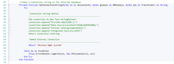 ByVal globals As BRGlobals,ByVal api As Transformer, ByVal args As ConnectorArgs) As String Try 'Get the values for the source row that we are drilling back to Dim sourceValues as Dictionary(Of string, Object) =