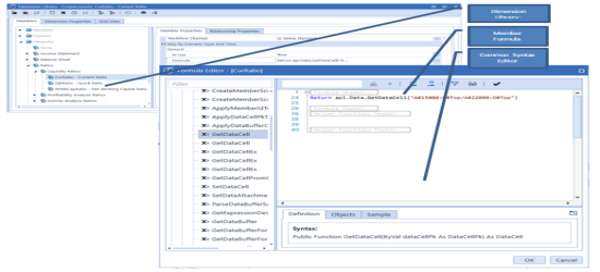 A Member Formula is assigned to a Dimension Member and executes within the Finance Engine during a Cube processing sequence. See Formula Guide in About the Financial Model for more information on processing sequences. Member Formulas provide the same level of syntax and logic capability that exist when writing a Finance Shared Business Rule, however custom consolidation, elimination, and translation logic cannot be written. Member Formulas are a great choice for writing logic limited to calculations based on a single Member and calculations that do not span Dimensions. If Member Formulas are written with these constraints in mind, then the Dimension Member and its formula can be reused in different Cubes without having dependencies on other Dimensions. This does not mean that a Member Formula cannot look at other Dimensions. Referencing Dimension Members outside of the specific Dimension where the formula exists will limit the reusability of the Dimension, or require all referenced Dimensions be used together in any new Cube.