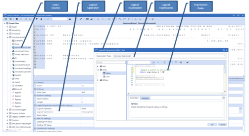 Apply Complex Expressions to a Data Source Dimension by selecting the Dimension requiring custom logic and setting the Logical Operator. The Logical Operator property opens the Logical Expression Editor dialog and allows the user to either select a Shared Parser Business Rule or write a Complex Expression. Both Shared Parser Business Rules and Parser Complex Expressions result in the exact same compiled Business Rule code. The exception is a Complex Expression is only executed for the Dimension to which it is applied, and a Shared Parser Rule is shared and can be called by many Dimensions.