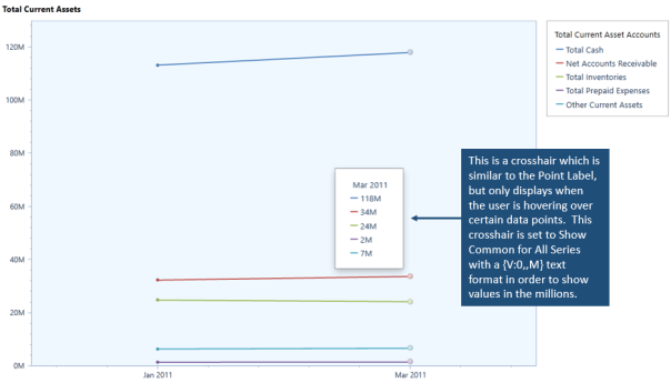The chart below is displaying product revenue by region. This data is driven by a Cube View where the Cube View Rows display the region and the Cube View Columns display the products. Only the Y axis can be customized with this chart type which is driven by the Cube View data. The Legend is driven by the Members on the Cube View Rows and the column Members display multiple axes organized in a circle.