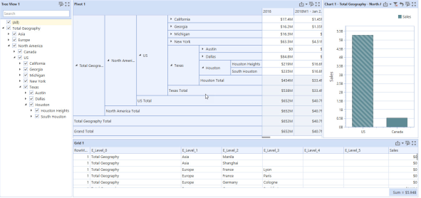 The Dimension Level property setting in the Cube View MD Data Adapter displays dimensional data as a hierarchical tree in the BI Viewer. Dimension leveling allows you to display data in a hierarchical structure into which you can drill down to view child data. After the data is leveled, you can use the BI Viewer to view data as a tree, a pivot table, a chart, or a grid.